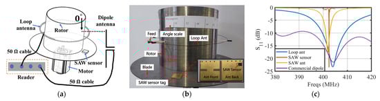 The experimental setup in order to verify the design of the loop antenna and the EM shielding problem of the system in a rotating metal environment is shown in Figure 6a,b, where Figure 6a is the equipment for dynamic temperature sensing with the rotation of the rotor and Figure 6b is the equipment for static temperature sensing. The stain-less steel barrel and disc for modeling the turbine rotor and blades are the same size as the simulation model in Figure 3i. An angle scale was attached to the rotor for indicating the relative position of the antenna and the SAW sensor. A comparative experiment was also conducted by using a commercial 400 MHz dipole antenna placed at 0 degrees of the angle scale.