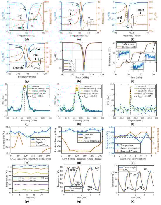 The frequency-sweeping curves of the RSSI output by the reader are displayed in Figure 6j–l, where the blue dots are raw RSSI data at every frequency point. The noise floor of these raw data is approximately −40 dBm. The green solid lines are these same raw data smoothed by a Savitzky-Golay filter with a frame length of 5 and weights of 7 for higher accuracy. The yellow points are data selected for fitting using a quadratic polynomial, and the black dashed lines are fitting results for the resonant frequency of the SAW sensor (). This fitting result corresponds to the vertex position of the fitted parabola displayed by the red solid lines in these figures. The fitted frequency is then converted to temperature data by linear transformation and averaged for noise reduction.