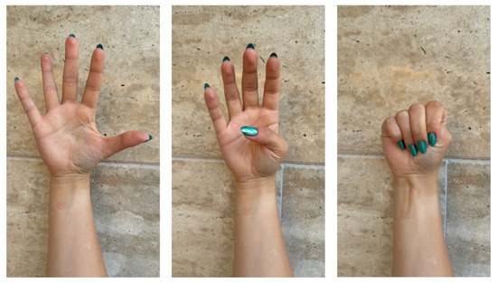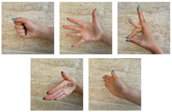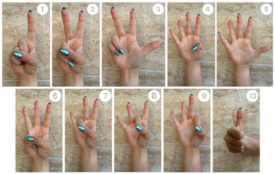 Data were collected using the BIOPAC MP36 device (Biopac Systems Inc., Goleta, CA, USA) with Biopac Student Lab software and with the MyoWare 2.0 sensor (Advancer Technologies, LLC, Raleigh, NC, USA) at the Faculty of Biomedical Engineering. Eight students from the Faculty of Biomedical Engineering and Applied Mathematics participated in the EMG signal recordings. The study group consisted of 4 women (50% of the participants) and 4 men (50% of the participants), with an age range of 23–26 years (average age 23.88). The first round of studies was conducted using the BIOPAC MP36 system. Before starting the signal recording, volunteers were informed about the study procedures and practiced selected sign language gestures. The Polish Sign Language expressions considered included: grandfather [35], airplane [36], dragon [37], red [38], pitcher [39], water [40], apple [41], pear [42], emergency gesture (SOS signal; see Figure 1), fist, double tap, spreading fingers, wave left, and wave right (see Figure 2), and numbers from 1 to 10 (see Figure 3) [34,43,44]. The next step involved disinfecting the right forearm of the participant and connecting electrodes as shown in Figure 4.