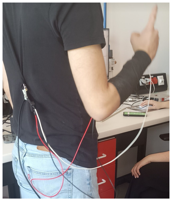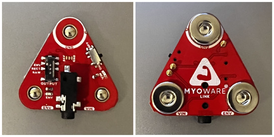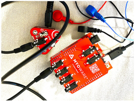 The MyoWare 2.0 Muscle Sensor, MyoWare 2.0 Link Shield, and MyoWare 2.0 Cable Shield were connected with snap-in connectors. The MyoWare 2.0 Cable Shield was connected to the A0 analog input on the MyoWare 2.0 Arduino Shield using the TRS cable. Biomedical electrode cables were connected to the MyoWare 2.0 Link Shield and the biomedical electrodes, and the USB A–USB C cable was used to connect the system to a laptop. The setup is depicted in Figure 10.