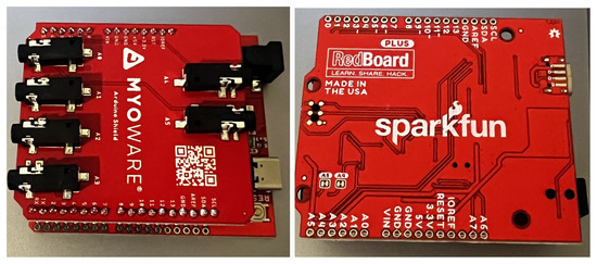 - MyoWare 2.0 Arduino Shield—Arduino overlay with SparkFun RedBoard Plus—Arduino-compatible development board;