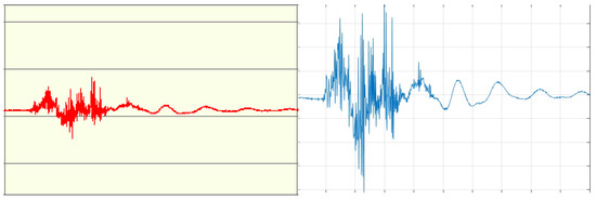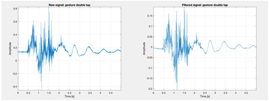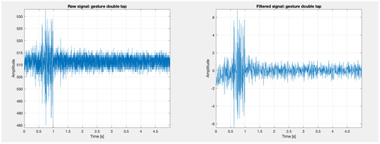 Signals recorded using the BIOPAC system were loaded into the MATLAB environment and subjected to preprocessing. The signal sampling frequency was 1000 Hz. Figure 11 shows the signal for a gesture ‘double tap’ obtained using the BIOPAC system. The red graph represents the original signal, which can be modified using the virtual BSL analysis tools provided with the measuring device. The blue graph was generated in MATLAB.