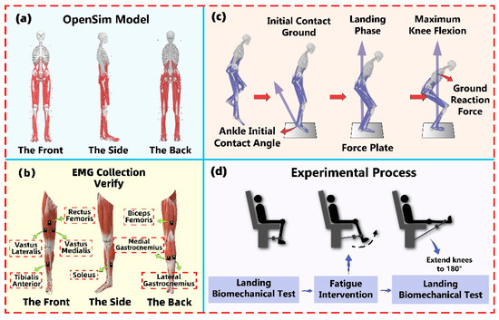 An overview of the musculoskeletal model and overall experimental procedure of the study. (a) An illustration of the position of the reflective marking points in the constructed musculoskeletal model. (b) An illustration of the placement of EMG sensors on human lower limbs. (c) An illustration of the SLJ test process, detailing the landing phase from initial ground contact to maximum knee flexion. (d) An illustration of the entire experimental process, consisting of three main steps: (1) SLJ biomechanics test before fatigue intervention; (2) fatigue intervention; (3) SLJ biomechanics test after fatigue intervention.