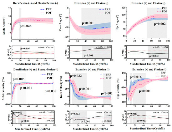 The SPM analysis revealed differences in joint kinematics during the landing phase when comparing PRE and POF conditions. Figure 2 displays the significant differences in ankle, knee, and hip angles and velocities during the landing phase between PRF and POF conditions. For the ankle, significant differences were observed in angle (18.64–23.31%, p = 0.046) and velocity (0–8.5%, p = 0.003) (13.7–33.2%, p < 0.001) (97.3–100%, p = 0.038). For the knee, significant differences were found in angle (29.49–100%, p < 0.001) and velocity (0–3.82%, p = 0.032) (6.41–41%, p < 0.001) (81.1–100%, p < 0.001). For the hip, significant differences were noted in angle (50.48–97.48%, p = 0.002) and velocity (8.28–13.79%, p = 0.016) (15.43–46.15%, p < 0.001). Table 1 indicates that during the SLJ landing phase, there are significant differences between the PRF and POF phases in ankle plantarflexion velocity (p < 0.001). Additionally, significant differences were observed in the knee flexion angle (p < 0.001) and knee extension velocity (p = 0.006). Finally, significant differences were found in hip extension angle (p = 0.002).