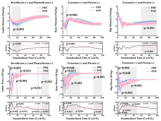 The SPM analysis highlighted significant differences in the kinetic parameters of the ankle, knee, and hip joints during the landing phase. Figure 3 illustrates these notable variations in the moment and power of the ankle, knee, and hip joints between PRF and POF conditions. For the ankle, significant differences were observed in moment (6.5–28.6%, p < 0.001) and power (0–8.27%, p < 0.001) (16.27–21.71%, p = 0.001) (25.6–28.1%, p = 0.021) (70.85–74.17%, p = 0.011) (82.02–100%, p < 0.001). For the knee, significant differences were found in moment (7.01–13.44%, p = 0.006) and power (0–2.54%, p = 0.040) (3.74–7.18%, p = 0.033) (9.36–44.05%, p < 0.001) (77.44–100%, p < 0.001). For the hip, significant differences were noted in moment (59.87–100%, p < 0.001) and power (0–4.64%, p = 0.004) (6.54–7.08%, p = 0.048) (9.38–14.41%, p = 0.003) (15.41–48.82%, p < 0.001). Table 1 reveals the significant differences in ankle plantarflexion moment (p = 0.002), ankle dorsiflexion power (p = 0.014), and ankle plantarflexion power (p < 0.001). Additionally, significant differences were observed in knee flexion moment (p = 0.006) and knee extension power (p = 0.036). Finally, notable differences were noted in hip extension power (p < 0.001).