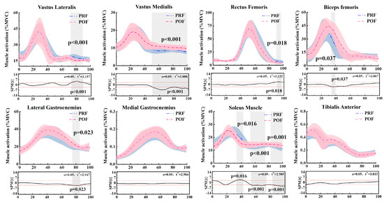 The SPM analysis indicated differences in muscle activation during the landing phase when comparing PRF and POF conditions. Significant activation differences were observed in the vastus lateralis (72.72–89.15%, p < 0.001), vastus medialis (50.23–100%, p < 0.001), rectus femoris (90.23–96.79%, p = 0.018), biceps femoris (34.05–39.51%, p = 0.037), lateral gastrocnemius (74.74–85.44%, p = 0.023), and Soleus muscle (33.08–42.87%, p = 0.016; 53.31–74.49%, p < 0.001; 82.64–100%, p = 0.001). In contrast, no significant activation differences were found in the medial gastrocnemius and tibialis anterior between PRF and POF conditions during the landing phase. Figure 4 highlights the differences in the activation of the Vastus lateralis, vastus medialis, rectus femoris, biceps femoris, lateral gastrocnemius, Soleus, medial gastrocnemius, and tibialis anterior muscles between PRF and POF conditions during the landing phase. Table 2 highlights significant differences in the biceps femoris (p = 0.030) and tibialis anterior (p < 0.001) between PRF and POF conditions.