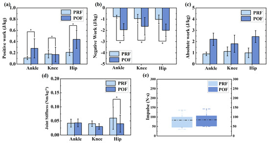 The changes in joint work, joint stiffness, and impulse between PRF and POF of the lower limb during the SLJ landing phase. (a) Positive work; (b) negative work; (c) absolute work; (d) joint stiffness calculated for the SJL landing phase. (e) Impulse (force-time integral) is calculated as the area under the GRF curve measured during the landing phase. “*” indicates a significant difference between PRF and POF conditions (p < 0.05).