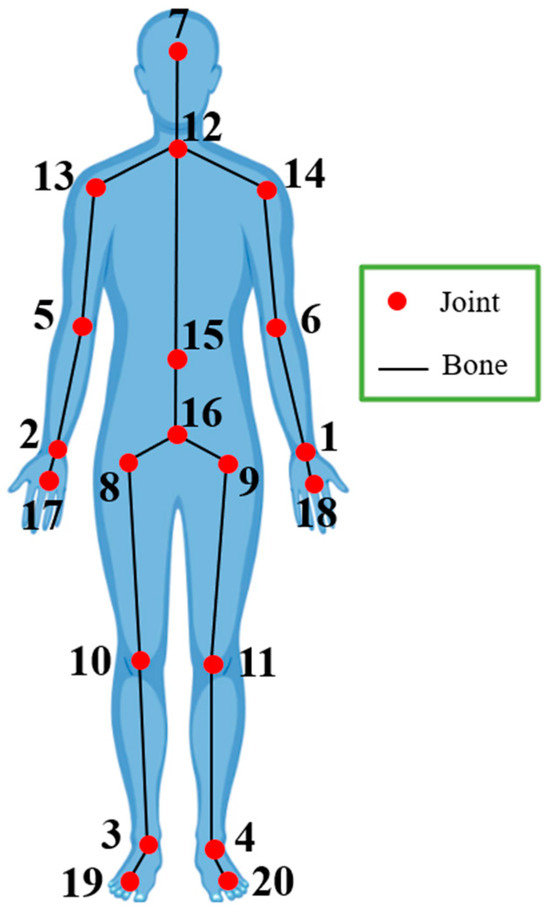 Real-time control of computer games or automatic evaluation of dance or physical exercises via depth videos are applications that require the initial identification and extraction of the human body and its skeletal structure [4,23,24]. Skeletal structure extraction involves identifying at least 20 3D joint points of the body, as shown in Figure 1, from each depth video frame. Tracking these points can help distinguish human actions and movements.