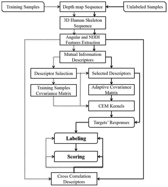 After selecting the discriminating descriptors and identifying the CEM detector kernels for every physical exercise, as outlined in the flowchart presented in Figure 2, the procedure for labeling unknown sequences will commence, following the solid arrows depicted. This procedure can be easily executed on a long sequence of depth videos containing extracted 3D skeletal nodes. To achieve this, the entire sequence of 3D skeleton nodes must be divided into recognized ∆t intervals using a sliding temporal window. Following this, by extracting the features listed in Table 1 for each frame, the selected descriptors for each targeted exercise will be produced in the form of () vectors. Then, the response vector of the CEM detector kernels, Equation (6), is calculated as represented in Equation (11).