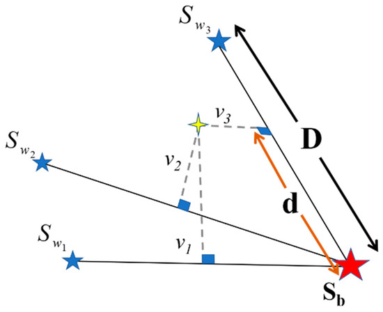 The stars in Figure 3 schematically represent the position of the vectors containing CC descriptors of the training samples related to the winning label of an exercise motion sequence. The red star is related to the position of the training sample with a perfect performance (score of 100), and the blue stars show the training samples with imperfect executions (scores less than 100). Here, the score of each star is displayed with and ,, and . As seen, three imperfect training samples have been drawn in Figure 3; however, the number of which can be different according to the available training samples in the scoring process. The yellow cross is the position of an exercise descriptors vector with the same label of drawn stars which score is unknown. The perpendicular distance of the yellow cross to the lines connecting each imperfect training sample to the perfect one is displayed with values to . During the scoring process, the line with the smallest perpendicular distance to the yellow cross is chosen as the reference for scoring. According to Figure 3, two distances: “” (the distance between the vertical projection of the yellow cross and the red star position) and “” (the distance between the red star and the associated blue one from the selected line) will be used to calculate the score. The mentioned (vertical projection of (a) the vector connecting the red star to the yellow cross on (b) the unit vector that is colinear with the vector connecting the winner line endpoints) is calculated by simply using the dot product. Therefore, it can be either a positive or negative sign. Equation (13) shows how to calculate the score for the example of Figure 3. This equation is designed based on a simple linear interpolation.