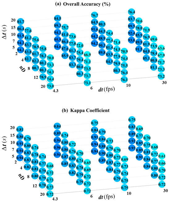 According to Table 3, a total of 100 modes of implementation of the proposed method with different adjusting parameters were designed to evaluate their effects on the labeling process. In each set of adjusting parameters, the accuracy of the labeling process was measured by indices of the overall accuracy and the Kappa coefficient extracted from the confusion matrix. To do so, the true labels of the physical exercises were assigned throughout the whole dataset and then compared with the predicted labels by the proposed method. The graphs presented in Figure 4 show the overall accuracy and Kappa coefficients of all 100 different sets of adjusting parameters in implementing the proposed method.