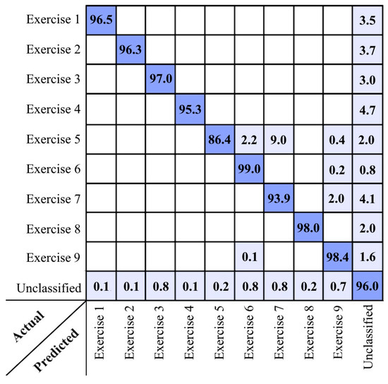 As can be seen in the confusion matrix reported in Figure 5, the main uncertainties were related to the unclassified class that has a large diversity. Some of the unclassified sequences were also related to the time interval that the sequence of skeletal nodes was not completely located at during the exercise movement execution.