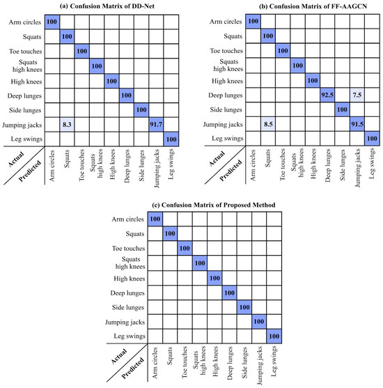 Next, we compared the results obtained from the proposed method using the best setting parameters in the second dataset with the results of [24] implemented on the same dataset. In [24], two deep learned neural networks named FF-AAGCN and DD-Net were used to label the nine actions in the sequence of 3D skeletal nodes. The confusion matrices of the proposed method and the mentioned comparison methods are presented in Figure 6.