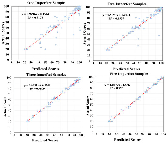 As seen in the scatterplots of Figure 7, increasing the number of imperfect training samples with scores less than 100 can be effective in improving the accuracy of the scoring process. However, there is no significant difference between the selection of three and five imperfect training samples. Therefore, it seems that the availability of at least three training samples with scores less than 100 can achieve favorable results in the scoring process. The slopes of the fitted line (near 1) and the R2 to each scatterplot indicate the low level of remaining bias in the scoring step. The Root Mean Square Errors (RMSEs) of the scatterplots represented in Figure 7 are also reported in Table 4.
