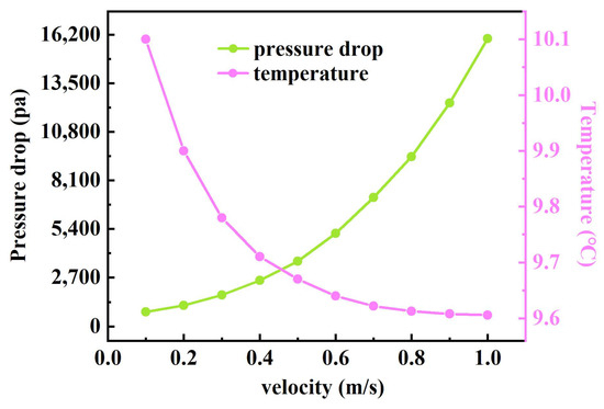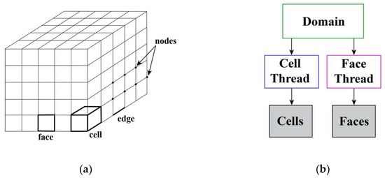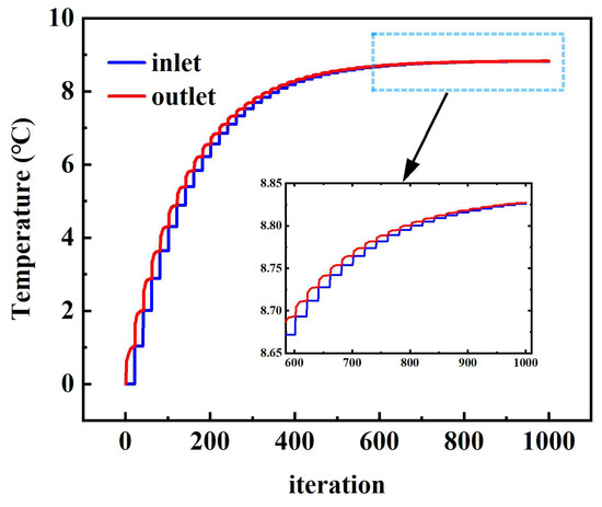 - When the number of iterations meets the convergence period, the face loop on the fluid outlet boundary face thread is executed. The actual area of a given face in the face thread can be calculated by Equation (8), where , , and are the three components of the area vector. Multiply and sum the area vector with the corresponding face temperature to obtain Equation (9), where is the number of face elements on the outlet boundary and is the area of the face . is the temperature information stored by the face , and Formula (10) represents the sum of the area on the outlet boundary face region.