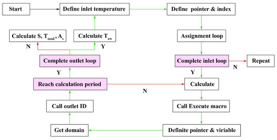 - Call the execution macro after each iteration calculation, define the fluid domain variable and the face variable , and call the thread corresponding to the fluid domain outlet boundary face ID. The update period of the inlet boundary is defined according to the number of steps that can reach convergence. Define variables (representing the sum of the product of each grid face area and its corresponding stored temperature information), (representing the average temperature value weighted based on the grid faces area at the fluid outlet boundary), (representing the sum of grid faces area at the fluid outlet boundary), and define array to store the area data.