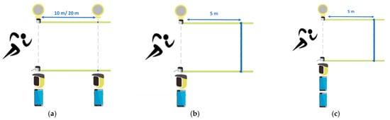 (a) Configuration for app validity assessment for a sprint in line test; (b) configuration for a go and return test; (c) configuration for app reliability assessment (Pictures adapted from https://training.microgate.it/en/products/witty/wittygate, accessed on 14 October 2024).