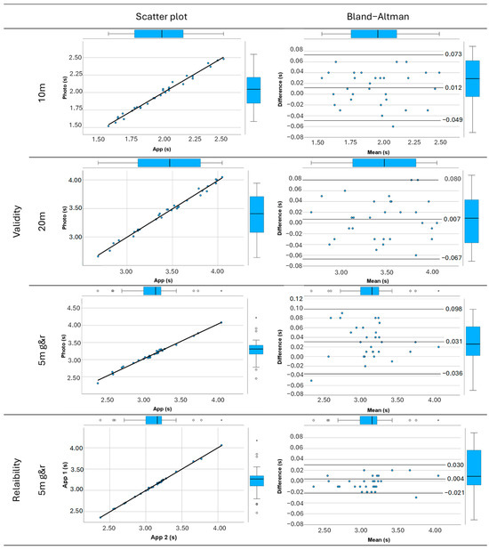 Validity: scatter plot with the linear regression of photocells (Photo) and the Photo finish® app (App) and Bland–Altman difference plot vs. average of bias between photocells and the Photo finish® app in 10 m separation, 20 m separation and 5 m go and return (g&r) trials. Reliability: scatter plot of the Photo finish® app (App 1 and App 2) and Bland–Altman difference plot vs. average of bias between the Photo finish® app (App 1 and App 2) in 5 m go and return (g&r) trials.
