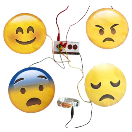 The game setup involves placing the circuit in a colorful, child-friendly box with holes for all the involved wires (Figure 5). This setup is designed to integrate seamlessly into a floortime therapy session. The hardware component includes four templates representing the primary emotions, covered with aluminum foil on the back for conductivity and feature pockets for connecting cables. Each emotion template is linked to a specific keyboard key (up, down, left, and right arrows), and a ground connection is achieved by connecting a cable to the “earth” pin on the board and attaching the other end to a conductive accessory held by the child.