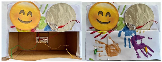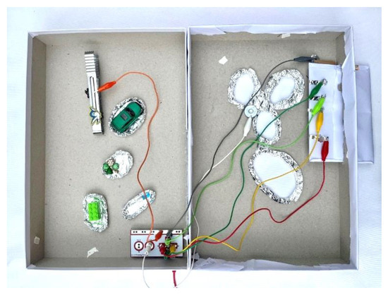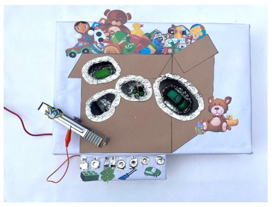 The physical setup resembles a colorful toy box with four extraction zones designated for specific objects (Figure 11). Conductive materials, such as aluminum foil, cover the components, facilitating circuit completion when placed correctly on the board. The game incorporates gamification elements, with a buzzing sound accompanying any attempt to cross the forbidden boundary, aimed at regaining the child’s attention and motivating them to complete the task.