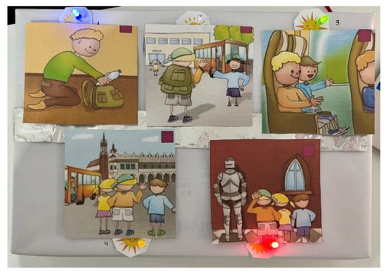 Set against the backdrop of a classic childhood outing—a school trip to a museum—this game unfolds in five captivating sequences. Each sequence invites players to decode images, unravel social cues, and piece together events in the correct order. As players progress, they place story cards onto the game board (Figure 8), marked with cheerful sun symbols and LEDs that light up upon correct placement.