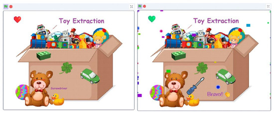 The game in Scratch includes random object extraction with no imposed order. Successfully placing an object triggers sensory effects, such as a sound, a green heart, and audio pronunciation. Touching the boundary prompts a more robust sound and the intermittent appearance of a red heart, designed to increase concentration (Figure 13). Errors are recorded for later observation of hand coordination improvement. The game continues until all objects are identified, with the final condition triggering a congratulatory window, showcasing variables and sensory effects. Through interactive gameplay and carefully crafted feedback mechanisms, Toy Hunt offers a supportive environment for children with ASD to practice attention and motor skills, fostering skill development and confidence.