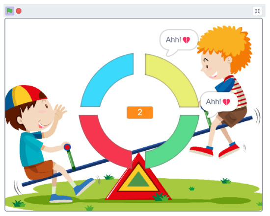 Scratch, the visual programming language developed by MIT, located in Cambridge, MA, USA, was utilized to create the software component of the system. Scratch’s drag-and-drop interface allows for creating complex interactive applications without requiring advanced programming skills. This makes it an ideal tool for developing educational games and activities tailored to the needs of autistic children. The Scratch extensions for Makey Makey enable seamless integration of physical interactions into digital projects, enriching the user experience and enhancing the educational value of the activities [24,25]. The use of friendly colors and sensory elements ensures that the learning experience is both enjoyable and effective, catering to the unique needs of children with autism.