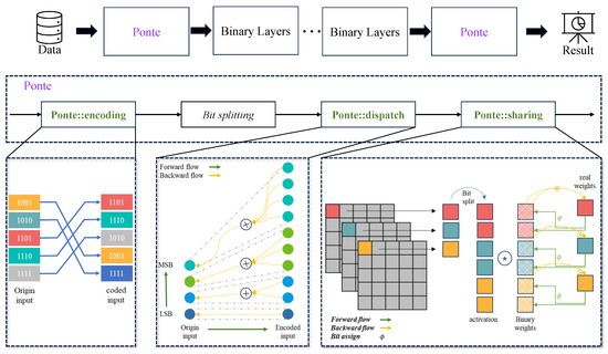 In this section, we will discuss the details of our contribution in the order above. Figure 1 illustrates the overall architecture of the proposed Ponte framework, which will binarize the first and last layers of BNNs. Our proposed architecture consists of three key parts while performing forward propagation before accessing the binarized first and last layers. The first operation is Ponte::encoding, which is a bit encoding method for both input activation (which is input pixel in 8-bit format) and the corresponding binary weight (grouped by eight and one-to-one correspondence with input activation). The role of bit splitting is to separate the encoded binary vector and decompose an n-dimensional binary vector into n channels value. The second operation is Ponte::dispatch, which is demonstrated as channel dispatch in Figure 1; other than conducting an operation on a pixel, which is a binary vector, the channel dispatch regards each bit as a single weight to perform the Ponte::dispatch operation. The third operation is Ponte::sharing, which demonstrates as latent-weight sharing in Figure 1. Specifically, we introduce the improvements of these three aspects in more detail.