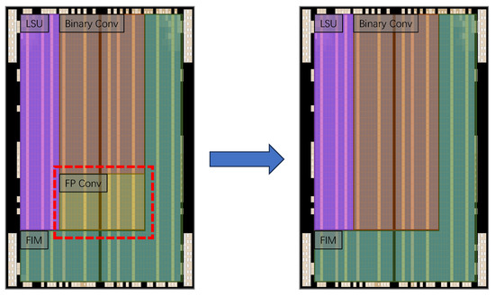 A concept schematic diagram of Chip plan in FPGA. The schematic diagram illustrates the chip plan for an FPGA with FP convolution-enabled BNN accelerator. The FP Conv logic occupies a large area with low active running states during a single inference.