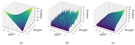 Output convexity compare. The INFP (input feature map) and Weights refer to the value of the 8-bit input feature map (images) and the value of an 8-bit vector, respectively, while the Product represents the binary MAC (BMAC) result of the INFP and Weight. (a) Optimized curvature of an 8-bit dot product. (b) Optimized curvature of adopting the BCD [34] encoding method. (c) Optimized curvature of adopting Ponte::encoding.