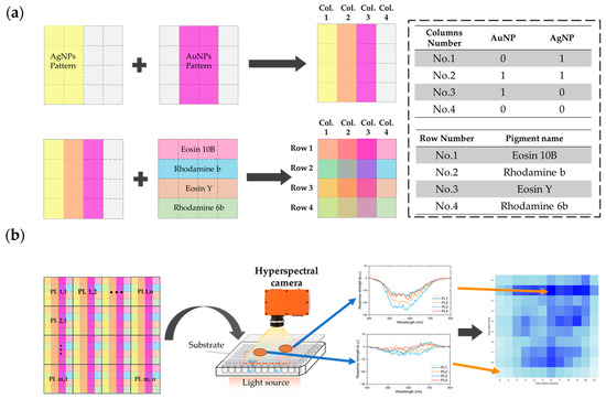 Fabrication process for the inkjet-printed subpixel gas sensor and its detection method. (a) Printing of silver nanoparticles (AgNPs; in yellow) and gold nanoparticles (AuNPs; in purple), which are arranged by column, and the pigments, which are arranged in rows. (b) Detection and visualization process of the inkjet-printed subpixel gas sensor. The wavelength figures here depict four sample subpixels for comparison and explanation.