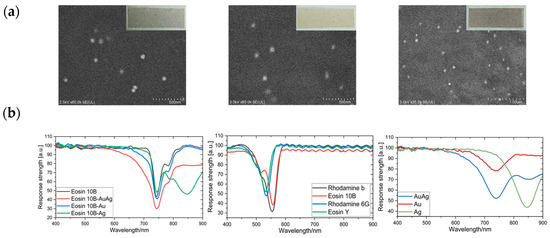 (a) Scanning electron microscope (SEM) images of the AuNPs (left), the AgNPs (middle), and both AuNPs and AgNPs (right) on the inkjet-printed LSPR sensor with the real printed pattern shown on the top right of each image in a different color. (b) Ultraviolet–visible (UV–Vis) spectra of Eosin with the different nanoparticles (left), a comparison of the different pigments (middle), and a comparison of the different nanoparticles (right).