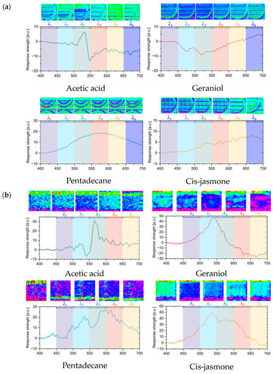 Differential spectra for 4 gases showing wavelength-dependent changes with respect to the average spectra over different ranges to highlight the differences. Acetic acid, geraniol, pentadecane, and jasmone are represented by the green, red, blue, and orange lines, respectively. (a) Average spectra obtained for a single subpixel sensor. (b) Average spectra obtained for another subpixel sensor.