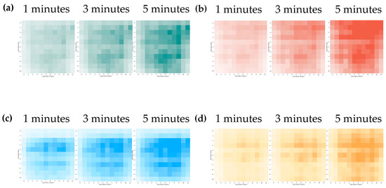 Visualization results for the gas spatial distribution and comparison of effects of exposure to a gas source for 1 min (left), 3 min (middle), and 5 min (right) for (a) acetic acid, (b) geraniol, (c) pentadecane, and (d) cis-jasmone. The X-axis and the Y-axis indicate the sensor location.
