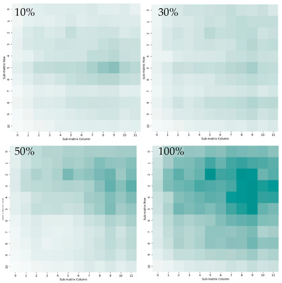 The concentration of the odor source solution can also affect the sensor detection and gas visualization results. In this case, acetic acid was used as an example substance at various concentrations (10%, 30%, 50%, 100%). The visualization results were compared after 5 min and the results of this comparison are shown in Figure 6. The color shades and darker areas varied proportionately with the gas source solution concentration.