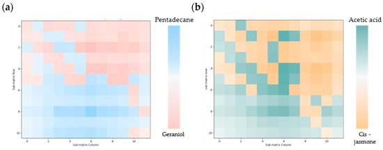 Visualization results for (a) pentadecane and geraniol, and (b) acetic acid and cis-jasmone based on a combination of the MSE and the PCA method.