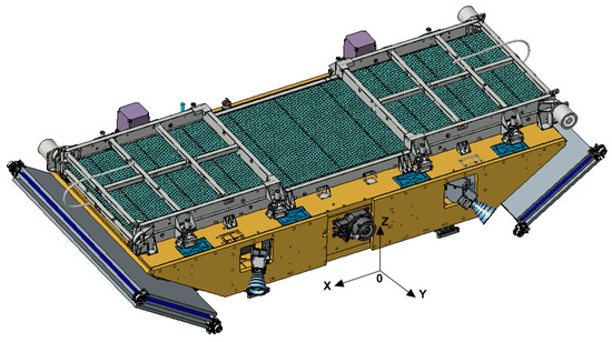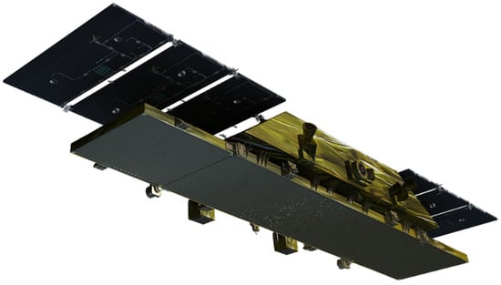 The satellite is in a stowed configuration before launch, as shown in Figure 1. The panels on both sides of the antenna are deployed after being in orbit, and the satellite configuration after deployment is shown in Figure 2. Considering that the antenna works in a 10:30 a.m. orbit at the descending node time, the external heat flow of the space environment changes violently, so the antenna adopts intelligent temperature control measures to ensure the stability of the antenna’s on-orbit temperature.
