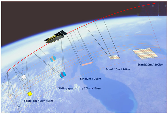 There are five main operating modes for the Ku-band SAR payload, including spot mode, sliding spot mode, strip mode, Scan 1 mode, and Scan 2 mode, as shown in Figure 4. The sliding spot or spot mode is used for the high-resolution monitoring of artificial targets, which is discontinuous in the azimuth direction. The sliding spot is mainly used for the high-resolution monitoring of single targets such as airports and ports. The obtained resolution is better than 1 m, and the scene width reaches 20 ×10 km, which can completely cover the mission area. Compared with the sliding spot, the spot mode has a scene width of only 5 × 5 km, but the data volume is 1/8 of the sliding spot, which is easier to transmit to the ground through the satellite data transmission channel. The imaging time is only 6 s, which can be used to cover multiple point targets. The strip mode is used for high-resolution continuous observations of urban rivers, surface coverage, etc., and can be used for emergency rescue and other applications. Scan 1 mode and Scan 2 mode are mainly used for low-resolution applications, including forest change monitoring, glacier monitoring, typhoon monitoring, and other applications.