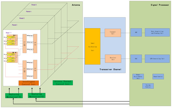Ku-band SAR is composed of three parts: the signal processor, transceiver channel, and phased array antenna, as shown in Figure 5. Considering the lightweight requirements of the satellite platform for the payload, the SAR payload is designed with high integration. The waveguide slot array of the SAR phased array antenna adopts a thin-walled structure design, and combined with a carbon fiber structure frame, the antenna surface density is greatly reduced. The transceiver channel has the functions of a transmitting channel, receiving channel, and internal scaler at the same time and is packaged in a single machine, which improves the integration level. The signal processor adopts a system-on-a-chip (SOC) structure and integrates chips such as ADC and DAC, which effectively improves the ability of signal generation, acquisition, and processing.