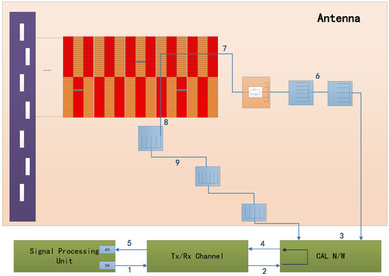 The coefficients for the error calculation can be derived from the computed antenna network, as depicted in Figure 6. The one, two, and three mentioned in the figure represent the loop of the internal calibration signal, which indicates the signal path of the transmission calibration, reception calibration, and reference calibration.