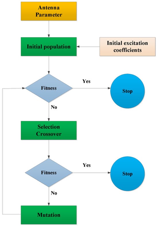 The technique for beampattern optimization is illustrated in Figure 7. The initial population is generated based on the Antenna Parameter, mainly including the initial amplitude and phase of each TR component of the antenna. Fitness is the fitness function for generating the antenna pattern calculation based on the amplitude and phase of the antenna TR component. If Fitness meets the requirements, the optimization stops; otherwise, it enters the Selection Crossover stage. This stage cross-selects the amplitude and phase of the TR component with a certain probability. After the cross-selection is completed, it enters the Fitness evaluation. If it still does not meet the requirements, it enters the Mutation stage. This stage represents the amplitude and phase of the TR component in binary and performs mutation operations on some values.