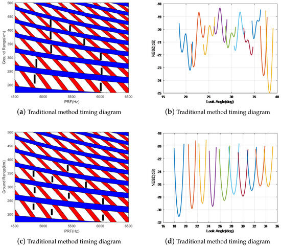 Pulse width is mainly related to the average transmission power, peak transmission power, and satellite energy. When the satellite energy is limited, the peak transmission power of Ku-band SAR is 4000 W. When the pulse repetition frequency of the transmission is fixed and when the transmission pulse width is too narrow, the average transmission power will be low, resulting in an NESZ lower than −18 dB, thus affecting the image quality.