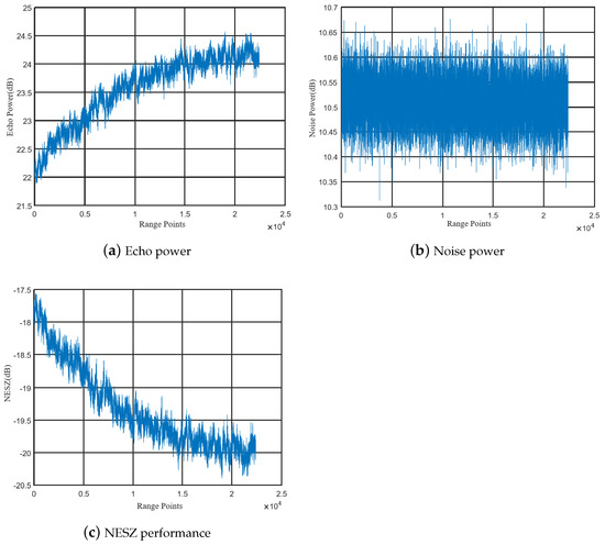 The evaluation results of the system sensitivity are shown in Figure 10. The X-axis means the range of sample points in this scene. Figure 10a shows the power received by the satellite in imaging mode, Figure 10b shows the noise power received by the satellite in noise calibration mode, and Figure 10c is the NESZ result analyzed according to Formula (8). According to the evaluation results, the sensitivity of the system at the center of the antenna beam reaches −20.0 dB, which meets the design requirements of the system. Considering that the on-orbit test was carried out in the early stage of the on-orbit performance, the antenna beam pointing is biased and was not corrected, so there is an asymmetry in the figure, but it does not affect the evaluation of system sensitivity. In this mission, the orbital altitude of the satellite is 524 km, and the corresponding slant range is 601 km. Considering that the atmospheric attenuation effect on the Ku band is less than 0.1 dB, the atmospheric attenuation is not considered.