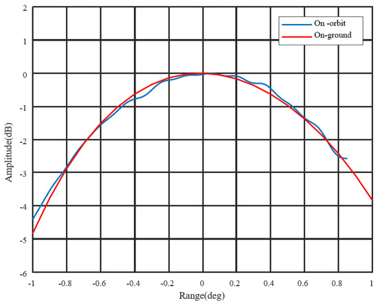 Antenna patterns are mainly evaluated using the Amazon rainforest. The payload evaluates the antenna pattern based on the results of satellite imaging by irradiating the Amazon rainforest with different beams. Considering that there are more than 5000 beams on board the satellite, only some antenna beams were evaluated during the on-orbit test. The result of the antenna pattern is shown in Figure 11. According to the results in the figure, the antenna pattern of the satellite in orbit is consistent with the ground test results, and the error is less than 0.5 db. Considering that all beams cannot be tested after the satellite is in orbit, it is necessary to evaluate all beams of the antenna according to the on-orbit test results of the wavelength division beam and combined with a high-precision antenna model.