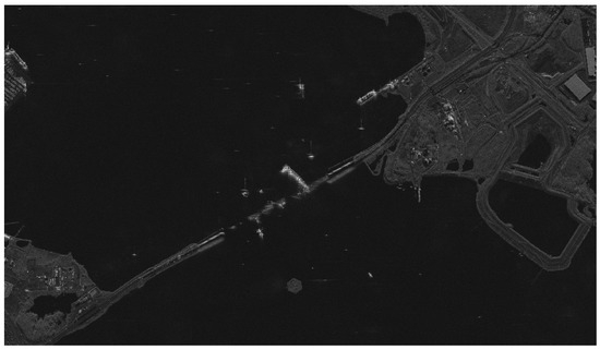 The SAR system can achieve better than 1 m resolution imaging in sliding spotlight mode, the range width is 10 km, and the azimuth width is 20 km. It can be used for the high-resolution imaging of local areas. The Francis Scott Key Bridge was a steel arch-shaped continuous truss bridge, the second longest in the United States and third longest in the world. On 26 March 2024, at 05:28 UTC, the main spans of the bridge collapsed due to a collision caused by the loss of power of the Singapore-registered container ship MV Dali, which struck the southwest supporting pier of the main truss section. The SAR image is photographed at 16:19 on 30 March 2024, as shown in Figure 13. According to SAR images, the bridge crashed into four sections, and a large number of ships were rescuing and repairing around it.