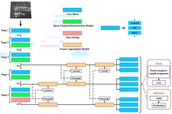 Figure 1. The main structures include a feature extraction network, feature fusion network, and detection head network, among which the main innovations include a space-channel reconstruction attention module, progressive cross-fusion mechanism, and feature aggregation module.
