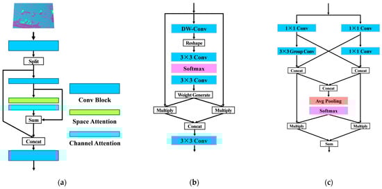 X, with the number of groups equal to the number of input channels to ensure channel information remains isolated. This operation generates nine feature maps of the same size as the input. These nine maps are then deformed into one, expanding the original feature map size by nine times. A subsequent 3 × 3 convolution with a stride of 3 produces a final feature map of the same size as the input, effectively applying different convolution kernels at various positions to achieve varying degrees of focus. The non-shared convolution kernel mechanism produces an intermediate feature layer, which is then activated using the SoftMax function and passing the threshold filter to create two weight layers. Weights exceeding the threshold are set to 1 to enhance high-intensity information