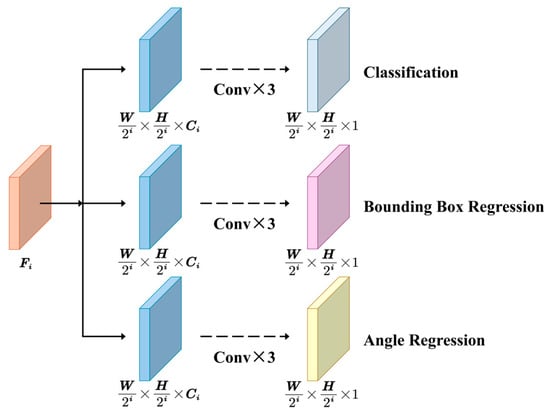 Figure 4 is utilized. This decoupling head is divided into three components: class prediction, bounding box regression, and bounding box angle regression. Each component consists of two 3 × 3 convolutional layers followed by a 1 × 1 convolutional layer. The class output predicts the probability of vehicle presence, the regression output estimates the bounding box’s position and size, and the angle regression output determines the bounding box’s orientation. Multiple points on the feature map
