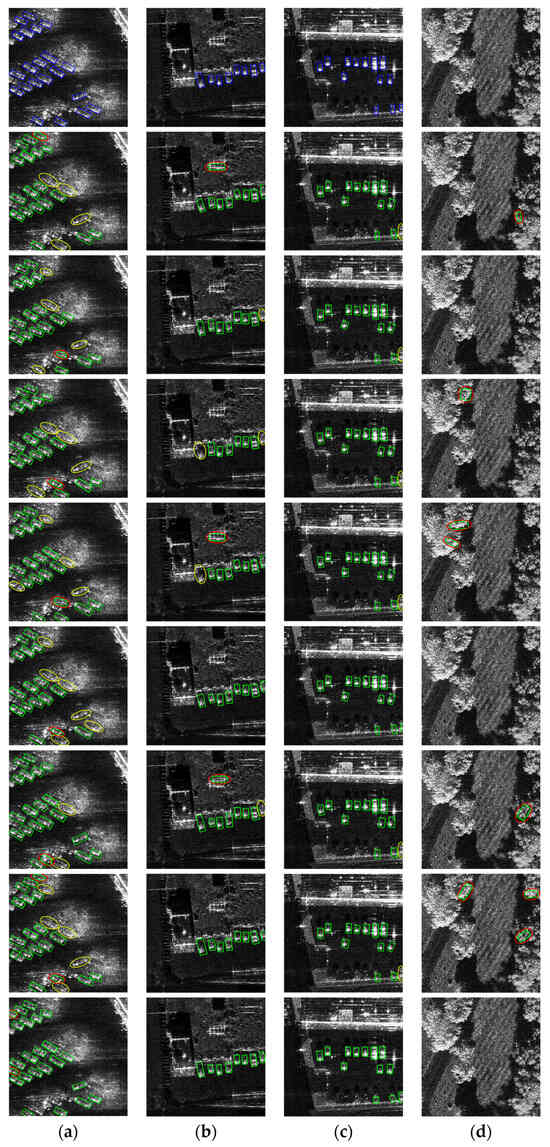 2A-Net, Oriented RepPoints, KFIoU, and our method, in which blue boxes indicate the real targets in the images, green boxes indicate the targets detected by the network, yellow ellipses indicate the missed targets, and red ellipses indicate the mis-detected targets. In the first image, the vehicle slice images are severely obstructed by vegetation; in the second and third images, there is strong interference from buildings; and the fourth image is a pure background image with a lot of disturbing information. The task of locating vehicles in these images is quite challenging.