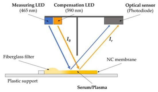 A two-wavelength reflectance photometer was employed to measure bilirubin and hemoglobin in the samples (Figure 1). The device used two distinct commercial LEDs to illuminate the sample at wavelengths of 465 nm and 590 nm, respectively (KPHHS-1005QBC-D-V and KA-1608SYSK, Kingbright, Taiwan). Reflected light intensity at each wavelength was detected by a photodiode (TEMD6200FX01, Vishay Intertechnology, Inc., Malvern, Pennsylvania, USA). The entire setup, including the sample, was housed within a dark chamber to prevent interference from external light and limit sample degradation. Essential electronic components for signal acquisition and digitalization were also incorporated. The angle of incidence of light on the sample significantly influenced the measurement results and system accuracy. This parameter was carefully considered in selecting the LED lens geometry, with flat transparent lenses chosen for their uniform light spatial distribution at relatively wide angles. Furthermore, the optical chamber’s geometry, including the arrangement and angle of the LED light sources in relation to the membrane surface, was fixed and kept constant throughout all tests. As a result, the influence of the incident angle could be disregarded. The 30 µL plasma samples were applied to disposable lateral flow test strips, which consisted of a fiberglass filter and a nitrocellulose membrane mounted on a plastic support. The fiberglass filter served to block and retain any red blood cell or fragment that might be present in the sample, thereby preventing their entry into the nitrocellulose membrane. As no light passed through the plastic support, the unabsorbed light was reflected in multiple directions within the optical chamber, enabling the photodiode to measure the reflected intensity.